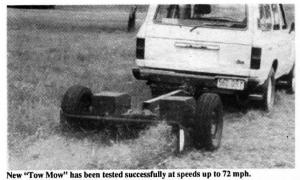 Designed to pull behind a pickup, utility tractor or even a car, the "Tow Mow" allows inventor Bill Morris to reduce cutting time on his air strip to 1 hr., operating at speeds of up to 40 mph. The first-of-its-kind mower has been tested at speeds of up to 72 mph but Morris recommends speeds from 6 to 40 mph as the best operating range.