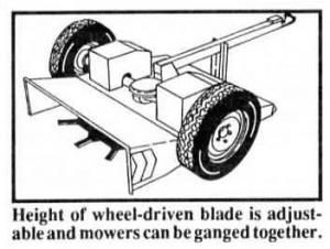 Morris used his knowledge of aerodynamics to develop the ground-driven mower's main cutting disc. The circular blade's height is adjustable and the 4-ft. wide mower can be ganged together in groups of three.
