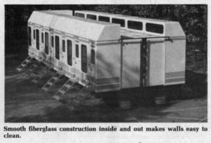 Each slide-out apartment has a twin bed, shower, flush toilet, and sink plus a wardrobe and shelf storage area. Each unit contains a fire extinguisher and smoke alarm. Heat and air conditioning is provided from a central propane-electric power system located on the gooseneck of the trailer. Fresh water is stored in a 200-gal. reservoir and sewage is carried in a 1,100 gal. tank located between the main I-beams of the trailer.