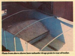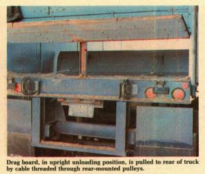 The system consists simply of a cable-powered drag "board" that's pulled along the floor of the trailer. The metal drag board is flared so, that when pulled toward the back of the trailer, it stands straight up and pulls grain to the rear. When pulled back to the front, it rides flat against the trailer floor with little resistance. Two cables strung between pairs of pulleys at the front and back of the trailer and driven by a heavy-duty winch mounted under the trailer bed ù automatically pull the 1-ft. tall drag board back and forth until the trailer is empty.