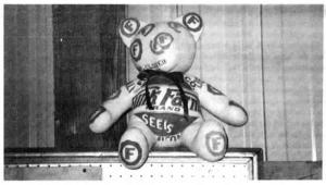 The seed corn bears are about 18 in. long and stuffed with a washable poly fill material. They're made out of sacks from a variety of companies or you can custom-order a bear made out of a sack from a particular company.