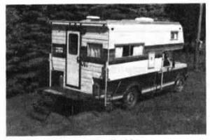 I've had a lot of interest in this porch I built on the back of my pickup camper. It's almost like adding an extra "room" onto the camper. I barbecue on it with a propane line that I run back from the tank up front. It folds up against the back of the camper when lifted and is secured in place with two lengths of chain. (Robert C. Huff, Rt. 6, Box 246A, Edmonton, Alberta Canada ph 403 472-6202)