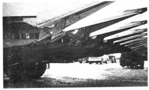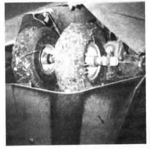 "The rolling action of the tires works much better than the dragging action of skid plates and keeps the cutting knives from being plugged up by mud and leaves," says Weathers, who has used the tires to harvest soybeans on 1,100 acres each of the past two years. "The tires really work great in the evening when the ground is a little damp but the soybeans are still dry. In these conditions skid plates tend to push soybean stubble and damp leaves along into piles causing the header to drag, whereas our tires roll right over them and let us work later into the evening. We harvested through muddy areas and even some standing water last fall and were able to cut soybeans close to the ground, which would have been impossible with skid plates. The tires also work better than skid plates in rocky ground because they roll right over rocks. We spent about $700 to install the tires." Buyno and Weathers bought the wheels from a lawnmower shop and the tires from a local tire dealer. To make the mounting brackets they cut 4 in. off the bottom end of each anhydrous knife making it 10 1/4-in. long. Two preexisting holes spaced 3 in. apart are used to bolt the bottom end of each knife to the skid plate mounting brackets. One hole was slotted and one hole was round. They used a cutting torch to convert the round hole into a slot. "If we want to apply more down pressure on the tires in order to raise the head higher, we simply loosen the bolts and reposition the brackets," ex-plains Buyno. They torched a 3/4-in. dia. hole in the other end of the knife to attach to the wheel shaft.