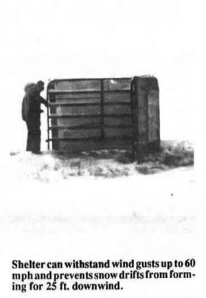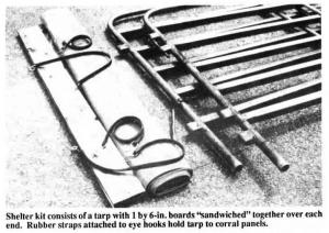 Developed by Robert Jairell and R.A. Schmidt at the Rocky Mountain Forest and Range Experiment Station near Laramie, Wyo., the portable shelter consists of a pair of 5 by 8-ft. common corral panels, four 1 by 6 in. boards, four rubber cords with hooks on either end, and a solid plastic tarp sized to fit the two panels (5 by 16 ft.).