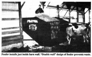 Jonas Stoltzfus, Loysville, Penn., says the 8-ft. wide feeder installs just inside the barn wall. The bottom end of the feeder rests on blocks. Cattle feed through double wall bars spaced 18 in. apart. The feeder is loaded with a front-end loader from outside the barn.
