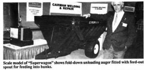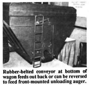 The "Superwagon 600" holds 600 bu. It's equipped with 13-in. dia. pto-driven unloading auger in front and orbital motors front and rear which power the 16-in. wide conveyor at the bottom of the wagon.