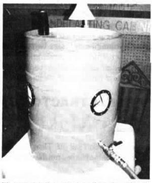 Compact Benchtop Design Of Blast N Barrel Sandblasting Cabinet FARM SHOP Maintenance 15-1-35 The compact benchtop design of my "Blastn-Barrel" sandblasting cabinet offers several advantages. It's constructed of high-density polyethylene which makes it highly durable. It's convenient to use. Simply plug an air hose onto the external fitting, then slide your hands into the 18-in. long cloth-lined p.v.c. gloves, grasp the trigger-controlled siphon-fed gun, and blast away. Two viewing windows on top allow a full view of the part being cleaned.
