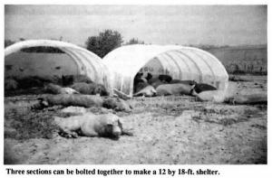 "They won't crack or break under normal use and stay much cooler in the summer than metal huts," says Doug Dyson. "Three sections can be bolted together to makea 12 by 18-ft. shelter. You can use a tractor and chains to transport the huts by bolting your own skids onto the sides and mounting a pipe across the front."