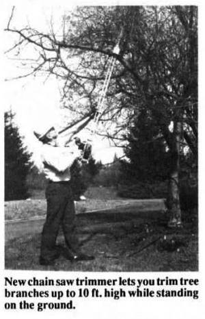 It uses a model 18 Poulan chain saw mounted on the end of a long twin-tube aluminum extension. A small roller chain inside the tubing powers the 16-lb. saw.