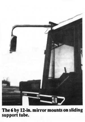 "It's a must for making safe left hand turns when pulling big wagons or wide loads," says Barry Kapplinger, president, Kiester Implement, Inc., Kiester, Minn. "The tube that supports the mirror slides easily in or out of the frame by simply loosening a bolt. The minor itself can easily be moved in or out and up or down."