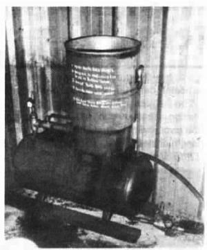 I run a small general repair shop and recently came up with this idea for transferring waste oil from inside the shop out to our 500 gal. bulk tank outside. The bottom tank is an old air tank while the top tank is the bottom half a water pressure tank we cut in half. We punched holes in a hog pan we stole from our hog lot and then slipped it into the top of the upper tank. A pipe connects the top tank to the bottom tank. We dump used oil into the top tank and open up a valve which lets the oil drain into the bottom tank. At the same time we open up a valve on a vent pipe to let air out of the bottom tank. After all the oil has run down into the bottom tank, we close both valves, hook up an air hose to the bottom tank and blow the oil out to the holding tank. If the bottom line gets plugged coming out of the tank there's a second air valve on the line coming out of the tank that lets you blow it out and start over. We haven't had much plugging problems, though, since we've got a screen in the bottom of the hog pan the oil is poured into.