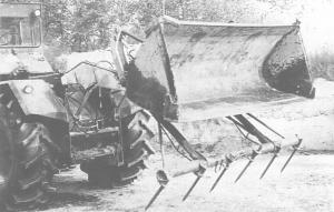 "I really like how the turned-around tractor handles. The loader is off an old Inter-national backhoe loader tractor which I al-ready had. The weight of the loader on back of the tractor counter balances the weight of the engine so it has great traction. I bolted the loader arms to tank mounting brackets on the frame above the rear wheels and mounted the loader lift cylinders onto the tractor frame."