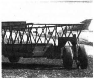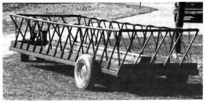 "We used almost all salvaged material including cow stanchions, channel iron door frames, corn elevator parts, wheels and hubs from an old AC combine, wheels and hubs from a fertilizer spreader, and used pipe and lumber.