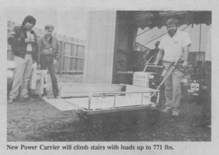 The new Power Carrier is available with an 8 hp Honda engine or a 5 hp engine. Rated carrying capacity is 771 lbs. for the large model and 536 lbs. for the smaller one.