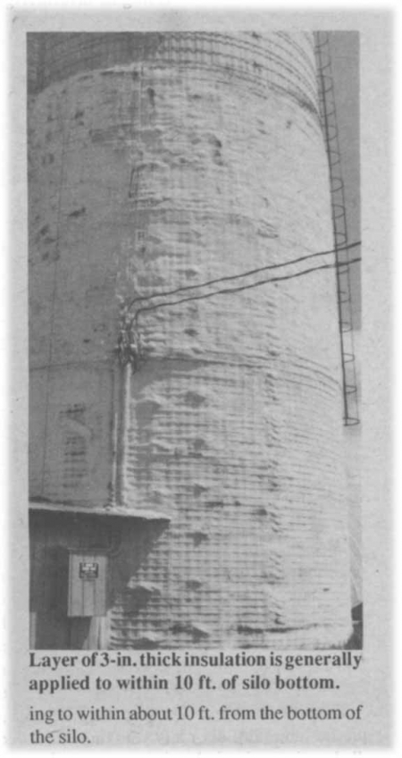 Insulation is sprayed on in warm, dry weather and generally is applied part way down from the top of the silo, corresponding to the level of haylage in the silo at the time when freezing weather arrives, and continuing to within about 10 ft. from the bottom of the silo.