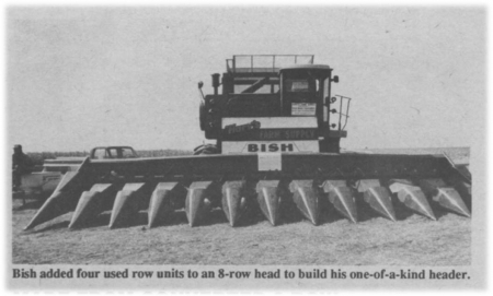 Bish started with an 8-row 30-in. International Harvester corn head. He added four used picking units, built the complete frame and auger, and installed a head quick-tach header adaptor for a Deere 8820 combine.