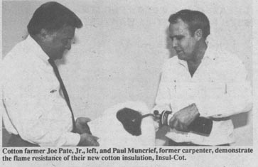 "Our insulation is so safe, you can rub your face in it," says Pate. Called Insul-Cot, it's made of 80% low-grade cotton and 20% polyester fibers. Unlike fiberglass, cotton insulation requires no protective clothing nor breathing devices during handling, yet it has the same R-value per inch as fiber-glass and will be priced the same.