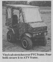 The wind and waterproof enclosure is made from heavy duty Herculite vinyl stretched over a strong but lightweight pvc frame. Four bolts secure it to the ATV frame. Vinyl side doors snap shut.