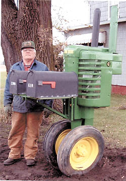 Ken Stonecipher, LaCrosse, Ind., took the front end of an old 1950 Deere G and made it into a new mailbox holder. He mounted it on a 4 by 6-in. piece of steel tubing with a 3-ft. square base welded to the bottom. The base is buried in the ground.