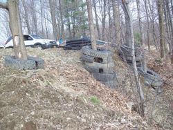 Recently, French put in a new waterline across a rocky slope. He will be putting more old tires to work there to stabilize the slope. He used this practice in the past in other similar situations.