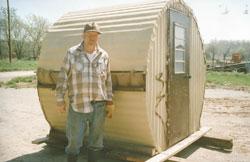 “I used siding from a junked mobile home and painted it tan. Openings on either side are covered by burlap sacks on a rod so they can be moved side to side for shooting. The blind is big enough for two grown men and can be quickly moved from place to place with pallet forks.