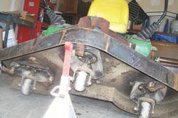 Williams fitted the deck with new disc-type mower blades that rotate around each caster wheel. Each “cupped” mower disc is fitted with 2 swinging cutter blades that cut a solid swath across the width of the deck. The caster wheel spindles ride inside the blade spindles, which in turn rotate inside specially designed hubs.