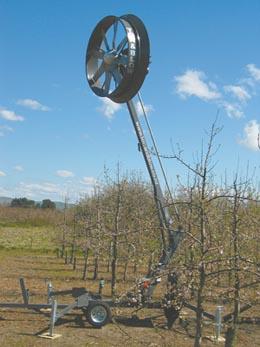 "We think it's one of the most interesting new products to guard against freezing temperatures or blazing heat in the last several years," says McAulay. His company has produced stationary wind machines for 23 years and marketed them around the world. Del Vanderhoff of Chamberlin Agriculture in Washington noticed the portable machine in Chile in 2014 and saw an immediate market for it. "It's ideal for frost protection, for misting, and evaporative cooling of tree, vine and ground crops," says Vanderhoff. Attaching mist nozzles makes it ideal for cooling and keeping flies away from livestock.