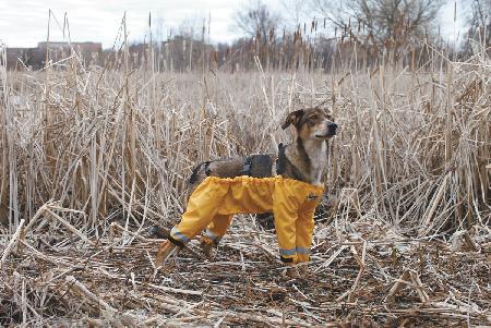 The coats come in yellow or black with reflective tape in sizes for dogs ranging from 3 to 130 lbs. Skelly notes short-legged breeds, such as basset hounds and dachshunds, have been hard to fit, but he hopes to offer a specialty coat for them soon.