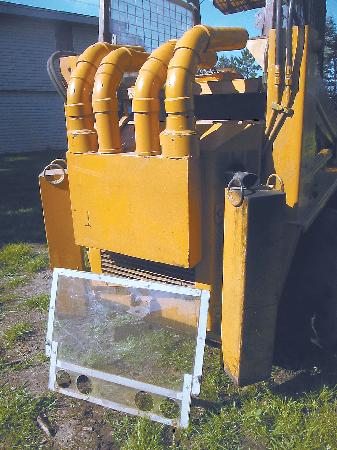 He used 1/8-in. thick steel to make a rectangular box the width of the grill on back of the engine and drilled four 3 1/2-in. dia. holes into the top side. The box, which is open on the bottom, hooks onto a pair of metal brackets on back of the skid loader door.