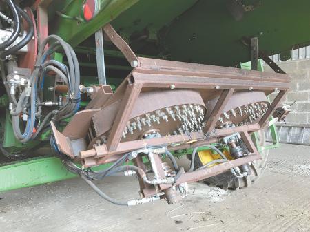 So Buckland devised a "pin mill" system that consists of two sets of discs fitted with extended 3-in. bolts. One disc of each pair spins while the other is static. Seeds are crushed between the discs before they're thrown out the back of the combine together with the chaff. There are 3 rings of bolts on the rotating discs and 2 rings on the static side.