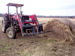 "The spike sticks out to the left of the loader," Yandell says. "Once you set the bale down with your center spike, you back your tractor up, turning just to the right of the bale until you are in line to spear it in the center with the side spike when you move forward again. With a little downward pressure from the spike, the bale starts unrolling as you move ahead. If you come to a wet spot, you can lift the bale up and set it down again where it's dry, or if you want to unroll only part of a bale, just lift it up and take it somewhere else."