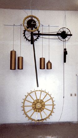 The serrated wheel is attached by a horizontal steel bar to another wheel with weights suspended from it. The weights ride on a chain that leads over to the serrated wheel and put constant tension on the wheel fins to keep the pendulum moving.