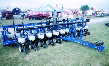 Filling the seed boxes on Kinze's popular Twin-Line planters has never been an easy job. You have to fill one row of boxes, then move over to the other side of the planter and fill the boxes on the other row. A new hydraulic-powered double cross auger mounts permanently on the planter and automatically does the job for you. "It saves a lot of labor and time," says Phil Kaster, Kasco Mfg. Co., Shelbyville, Ind., who introduced the unit at the recent Ohio Farm Science Review show near London, Ohio. "It takes only about 10 minutes to fill the seed boxes compared to a half hour or so without the augers. The problem is that you can't reach far enough to fill both rows of seed boxes from one side of the planter." The system consists of two 6-in. dia. bristle augers mounted on a steel frame that bolts onto the planter. Each auger is equipped with a hopper at one end as well as lengths of flexible tubing that run down to each seed box. The augers are powered by independent hydraulic motors that plug into hydraulic outlets on the planter's control box and are activated by opening a valve. You flip a switch in the tractor cab to activate the hydraulics, then go back to open one of the control valves and start one of the augers. It fills the boxes one at a time. When all the boxes in one row are full you shut that auger off and start up the other one. "We built it in response to requests from farmers," says Kaster. "Each auger is equipped with two flexible joints that allow it to flex with the planter according to the terrain. So far it's available for Kinze 2600 and 3600 12-row Twin-Line planters, but we plan to also make a system to fit16-row planters."