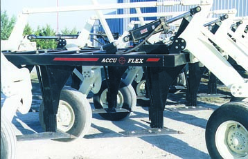 The "Accu-Flex", as McNichols calls it, was designed by McNichols' friend Herb Jeffery. It's built in a series of 5-ft. wide sections that are joined at the front by 30-in. long flexible "tie bars". Each tie bar connects the center of one section to the end of the adjacent section and serves as a pivot point, allowing all sections to flex and twist independently. The front of each section is free to flex up or down via a series of ball joints. Each section is equipped with "shallow draft" sweeps that mount on hollow shanks set 20 in. apart. Tillage depth is controlled by a single hydraulic valve. Three sets of fertilizer tubes mount inside each shank and exit under the sweep, allowing application of an-hydrous ammonia or liquid fertilizer. A seed tube mounts behind each shank.