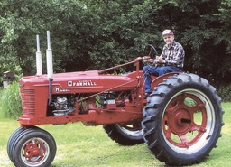 Homer Weber has a Farmall H with a 500cc, twin shaft drive, Honda motorcycle engine. While he doesn't know what the drawbar horsepower is, he knows he can do 35 mph down the road when he drives it to area parades. "I repair farm machinery, and a customer had an H with a bad block," recalls Weber. "He didn't want to fix it, so he sold it to me as is. I had this old motorcycle engine, so I decided to stick it in the H." Weber fabricated mountings for the engine and modified the H drive shaft and the shaft coupler to the five-speed Farmall transmission. He cut off the original H clutch shaft and welded it to the Honda drive shaft. He used the universal joint from the Honda and substituted a true universal at the H's rear end. "The coupler in the back of the H wasn't a true universal, so I had to put a universal in to match the one on the Honda drive shaft," explains Weber. The Honda engine block contained the original five-speed motorcycle transmission and clutch. When Weber was finished with his modifications, he had a tractor with 25 forward gears and 5 reverse. He attached the Honda clutch to the H clutch pedal so he could shift both transmissions at once. He connected a rod from the Honda gear-shifting pedal to the former hydraulic lever by the steering wheel. To finish it off, Weber mounted a tractor exhaust on each side of the Honda two-cylinder. "When I put it in first, it just creeps along, but when I put it in the top gear, it will do 30 to 35," says Weber. "I use it to pull equipment in and out of the shop, but mostly it's just used for fun."