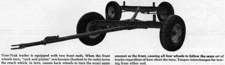 If you're handy with a welder and can round up two front ends, you could buy the True-Trak "rack and pinion" mechanism and build your own four-wheel steer trailer. "You may be able to special order a duplicate front end direct from the manufacturer of a wagon you already own. Or, you may be able to buy a used running gear from which you could salvage a front end to match one you already own," Wolf points out.