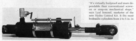 "It's virtually foolproof and more dependable than conventional screw-on or snap-on mechanical stops," says Lyal Ismond, marketer of the new Hydra Control Kit. It fits most hydraulic cylinders from 2 to 5 in. in dia. with an 8 to 16-in. stroke. Optional push rods are available for shorter or longer cylinders.