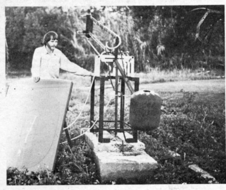 In outward appearance, the solar pump resembles an oversized playground see-saw. A long steel boom swivels on an axle about 42 ft. off the ground. The resultant mechanical energy takes the form of this boom see-sawing about its axle. Rods connect it to the conventional plunger pump in the well -- much like a conventional windmill set-up.