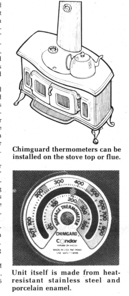 "It's an energy meter for your wood stove. It tells the temperature at which your stove is burning so you can take the necessary steps to maintain the best burning conditions," explains Suzanne Hundt, sales correspondent for the Condar Company, manufacturer of the new Chimguard Magnetic Thermometer. It attaches magnetically to the flue pipe and measures surface temperature.