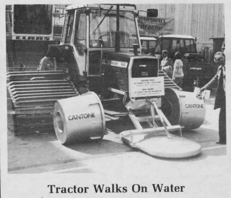 It might be an exaggeration to say this conventional tractor, outfitted with a new flotation rig, will "walk on water," but not by much. With big floats replacing the front tires, a large, flat float extended in front of the tractor, and super-wide, light-weight tracks in back, deep water is about the only thing that could stop it.
