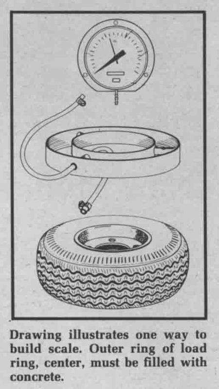 Bradbury also sells a complete tire scale kit. A new 15-in. radial tire, with a load ring and 6-in. gauge is available. All you have to do to complete it is to put water in the tire and fill the load ring with concrete. All components are available separately for any size ranging from bicycle to tractor tires.